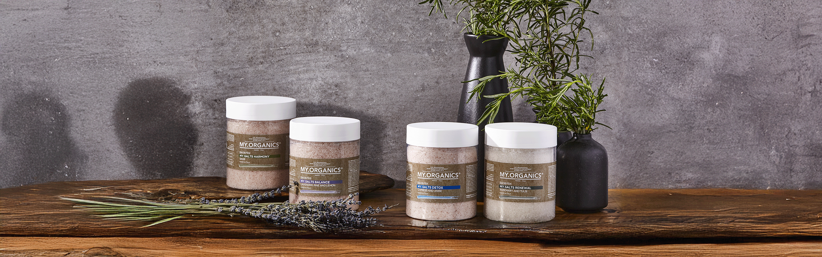 Four types of salt, from the Himalayas and from the Dead Sea, enriched with a careful selection of the finest pure MY.ORGANICS essential oils. These salts transform every treatment into a wellness ritual that deeply purifies, rebalances, and stimulates the scalp.